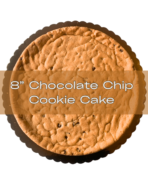 8", chocolate chip cookie cake. Be specific. Please include description of text/writing and icing colors....